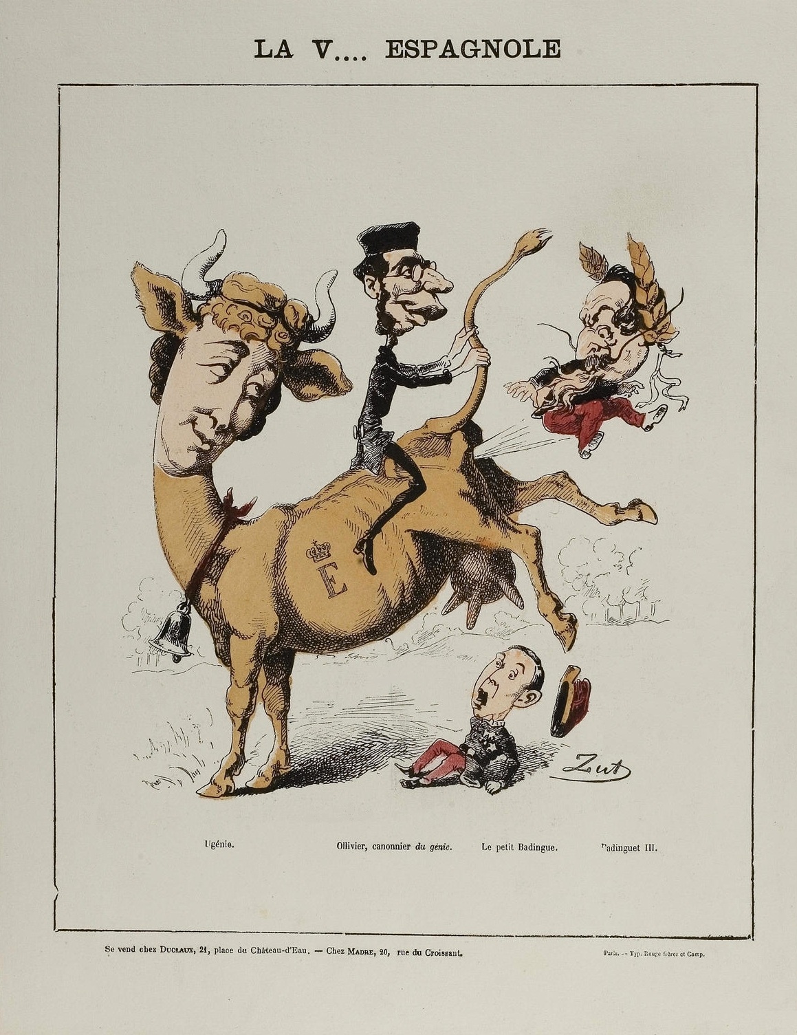 Imperatriz Eugénie, esposa de Napoleão III, retratada como uma vaca e lançando sua família longe. Gravura de Alfred Le Petit.