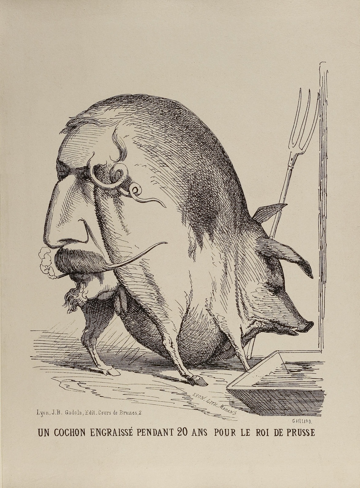 (Um porco de engorda de 20 anos para o rei da Prússia) – Napoleão III como o traseiro de um porco. Caricatura G. Gaillard, litografia por Morand.