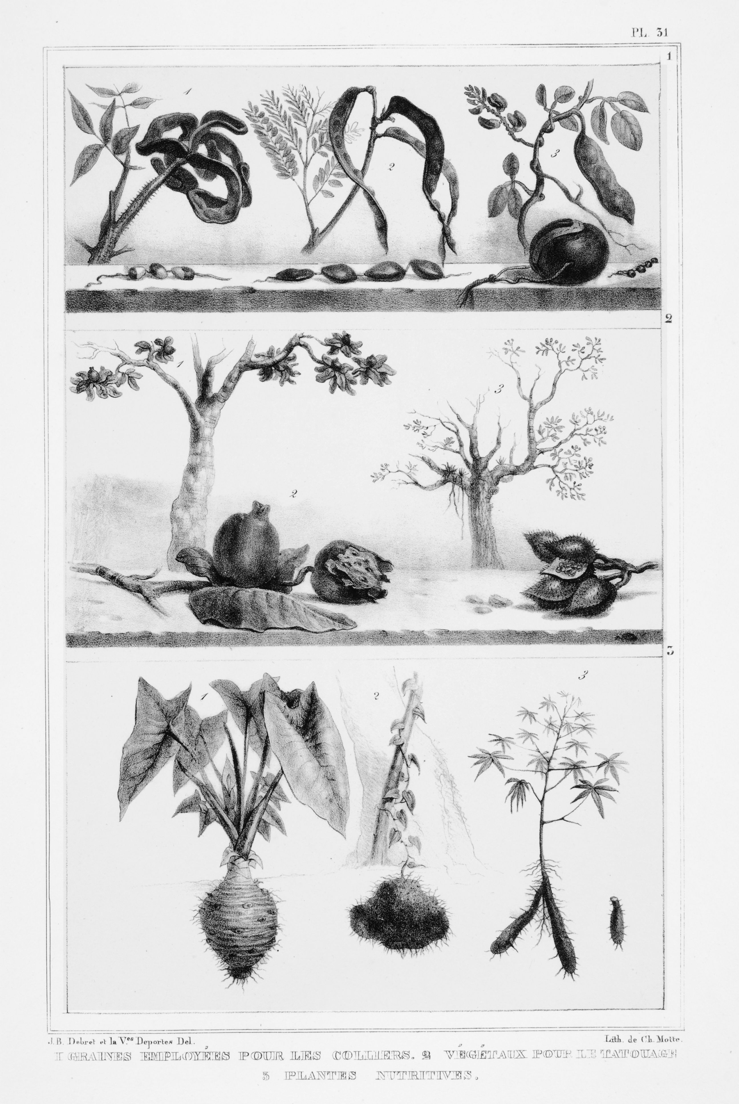 Graines employées pour les colliers (1). Végétaux pour le tatouage (2). Plantes nutritives (3).