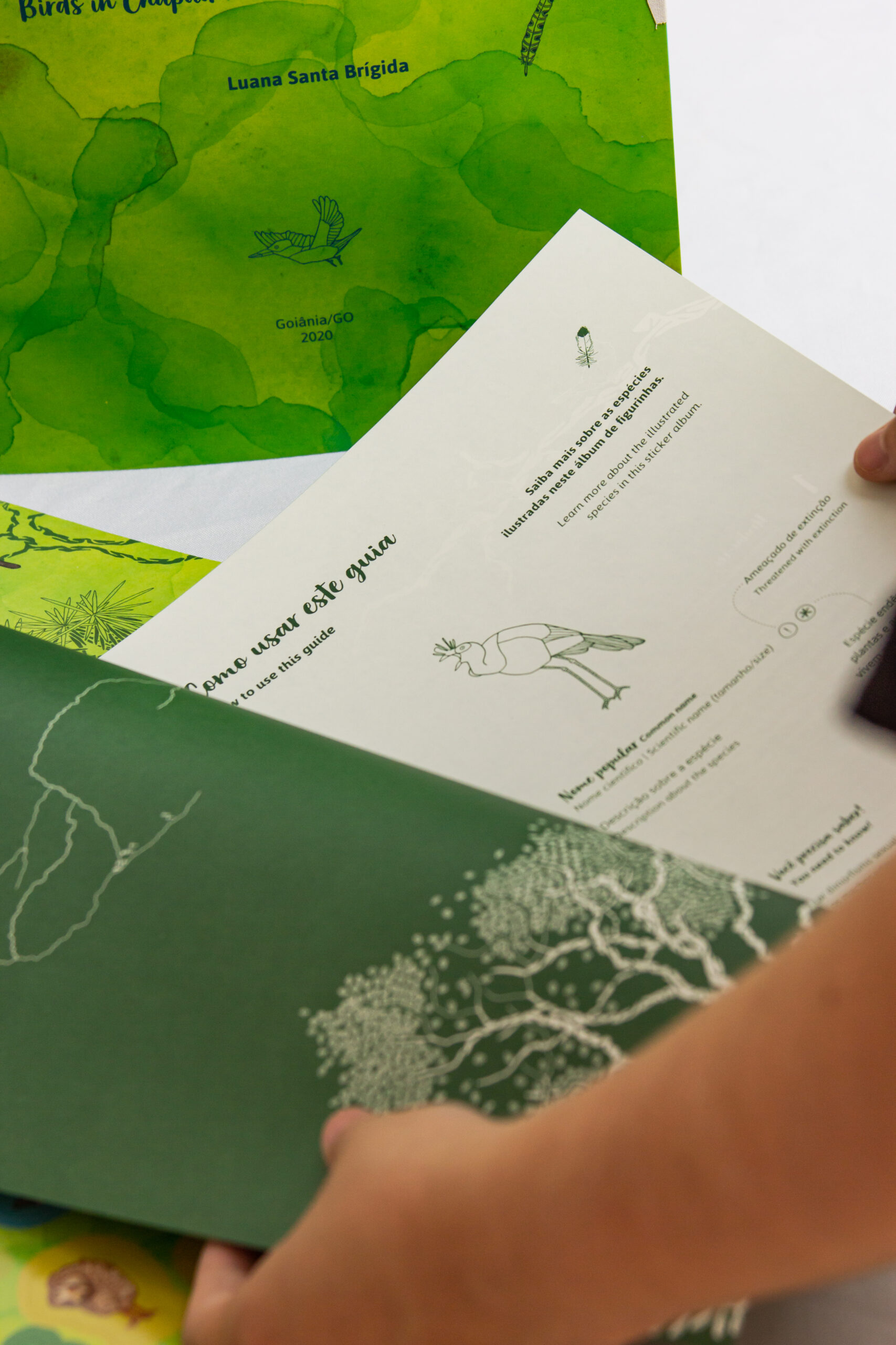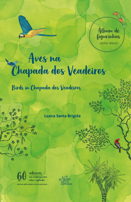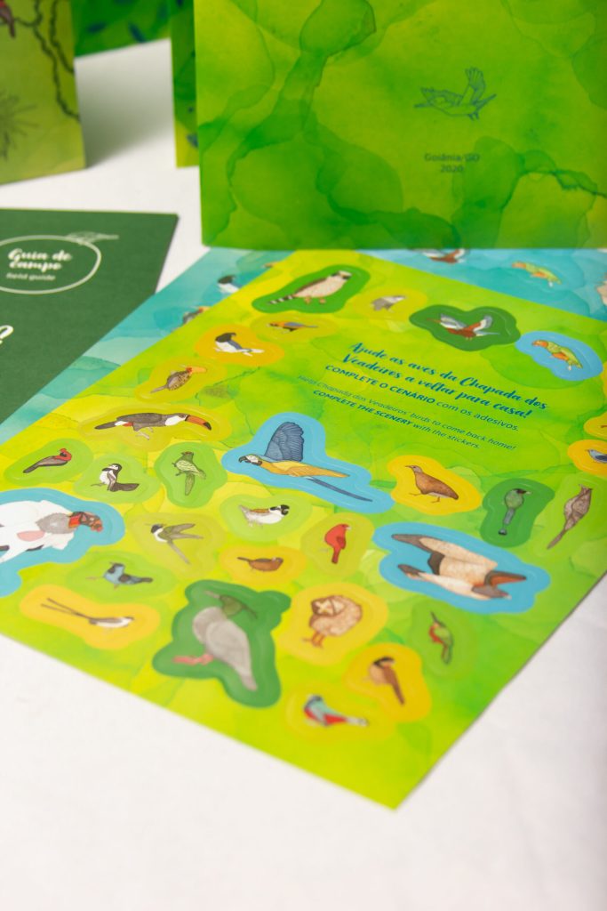 A publicação, que é bilíngue (português/inglês), é um álbum de figurinhas que vem ensacado num lindo kit com um pôster, para colocarmos os passarinhos todos, um guia de campo, que são as instruções para descobrirmos o lugar de cada passarinho, e que é também um pequeno manualzinho das espécies encontradas na Chapada dos Veadeiros, e tem a cartela de figurinhas para colocar no pôster, que vem com uma cópia extra para enfeitarmos o mundo por aí.